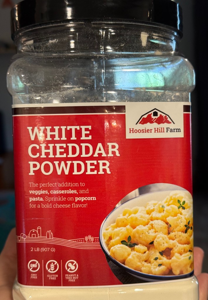 This is a must have in any kitchen- the Hoosier Hill Farms Cheddar Cheese powder! I use this to even flavor my marinara sauces and chili sometimes for a cheesy creamy texture and flavor. It is so easy to use- just add butter and cream. Do not overheat the ingredients, just mildly warm is plenty to get a good cheese sauce going.
