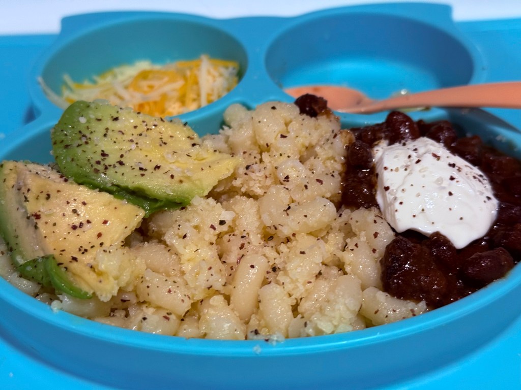 Either tortillas work: Food For Life’s Sprouted Corn Tortillas or De Casa’s yellow corn tortillas, but we prefer the latter for tiny mouths.